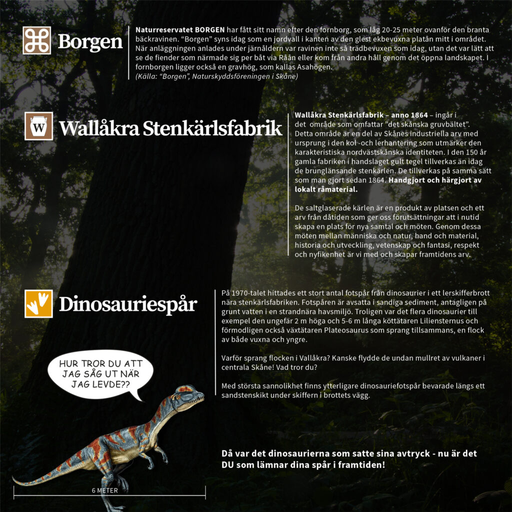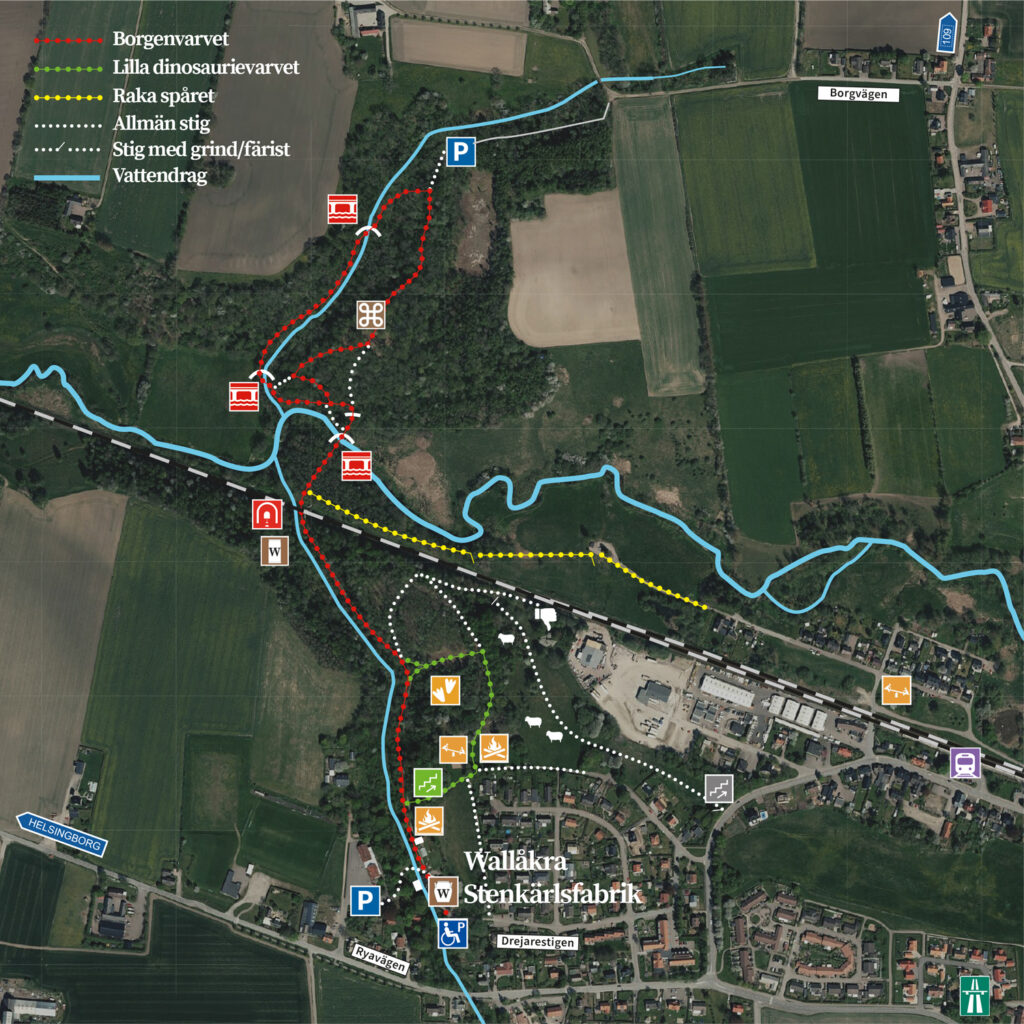Stigarna slingrar sig genom reservatet och leder till flera olika varv som passar både stora och små – från Lilla Dinosaurievarvet till Borgenvarvet. Varje steg blir en resa bakåt i tiden, där naturen själv är berättaren.